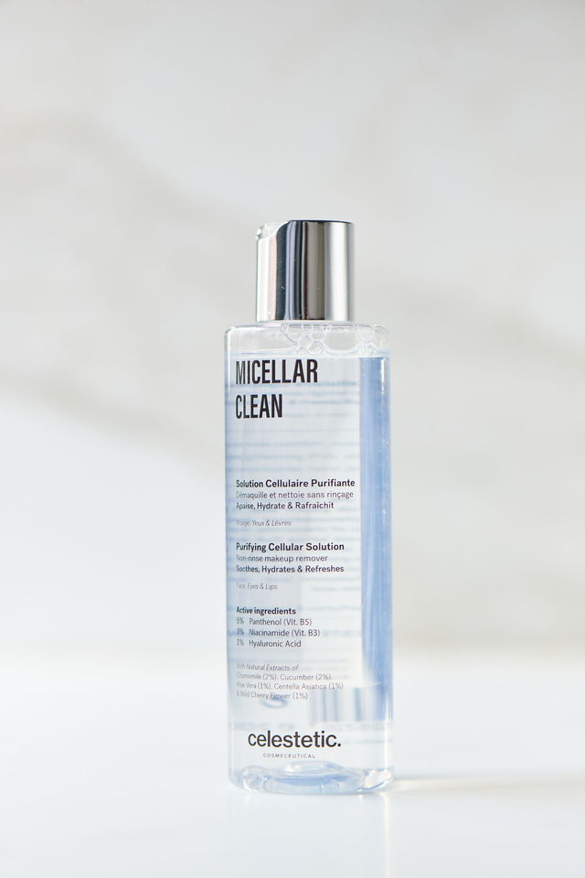 La solution démaquillante MICELLAR CLEAN élimine efficacement le maquillage, même waterproof, ainsi que toutes les impuretés accumulées sur la peau (pollution, filtres solaires, toxines, cellules mortes). Enrichie en vitamines B5 et B3 et en aloé vera, elle nettoie en profondeur tout en respectant l’équilibre cutané. Ses propriétés apaisantes et hydratantes apportent douceur et confort à la peau, aux yeux et aux lèvres, tout en laissant une agréable sensation de fraîcheur.